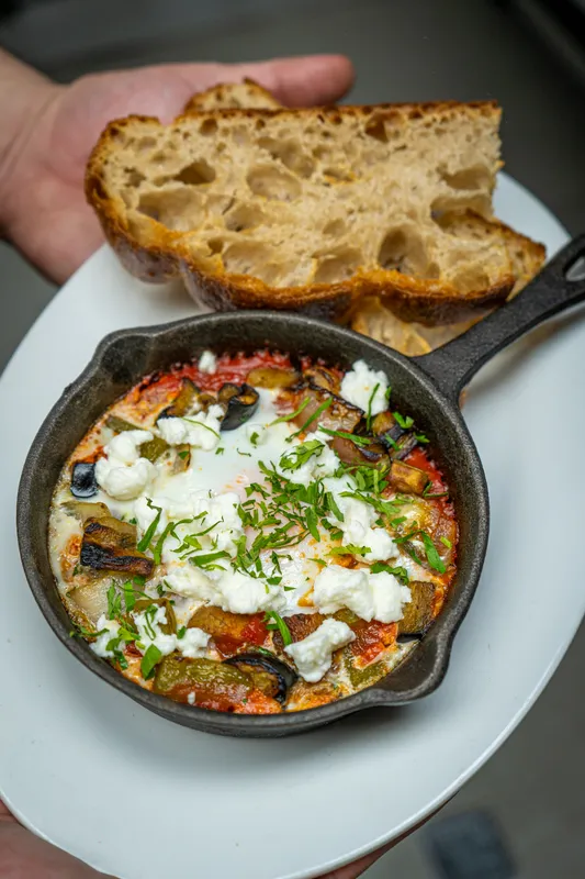 Huevo de campo, Berenjenas, champignones y pimentones asados, salsa pomodoro asada, ricotta y perejil con focaccia.